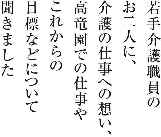 I.S―私は今年30歳なのですが、4人いる男性の介護職員の中で一番若手なので、職員同士のコミュニケーションの仲立ち役としても盛り上げていきたいです。それから、20代の職員が一人だけなので、毎年一人でも若い職員を採用してほしいです。SNSや広報などを使って、介護の仕事の楽しさや高竜園のことを工夫してもっと発信していったらいいと思いますし、自分ができることがあれば協力してやっていきたいです。