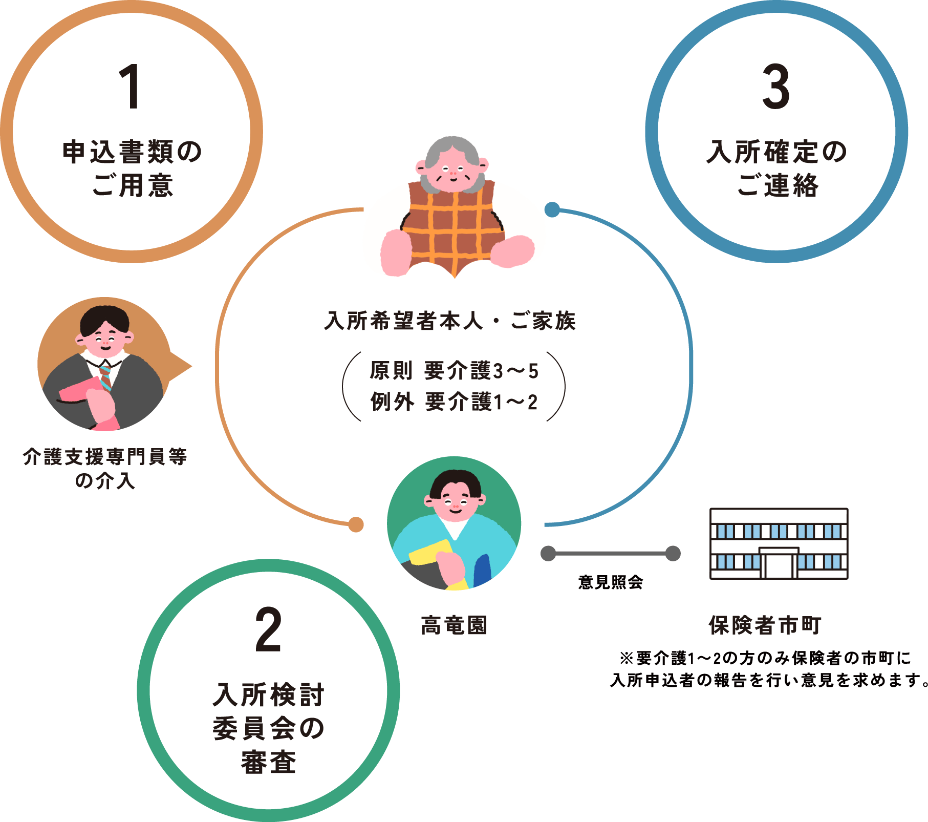 必要に応じて介護支援専門員等の意見書を添付します※詳細は、入所の指針(PDF)をご覧ください。
