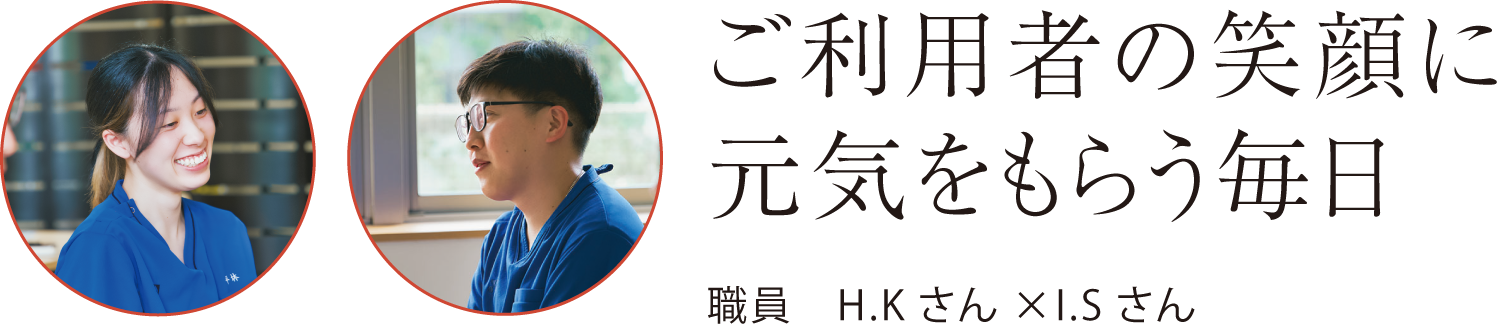 I.S―介護全般と、係として食事席(ご利用者の食事の席を組む)と排泄表(排泄の順番を組む)の作成を担当しています。ご利用者に喜んでもらえたらやはりうれしいですし、お笑いの好きなご利用者と冗談を言い合ったりするのも楽しいですね。しかし、ご利用者を看取ることもあって、それには慣れることができません。