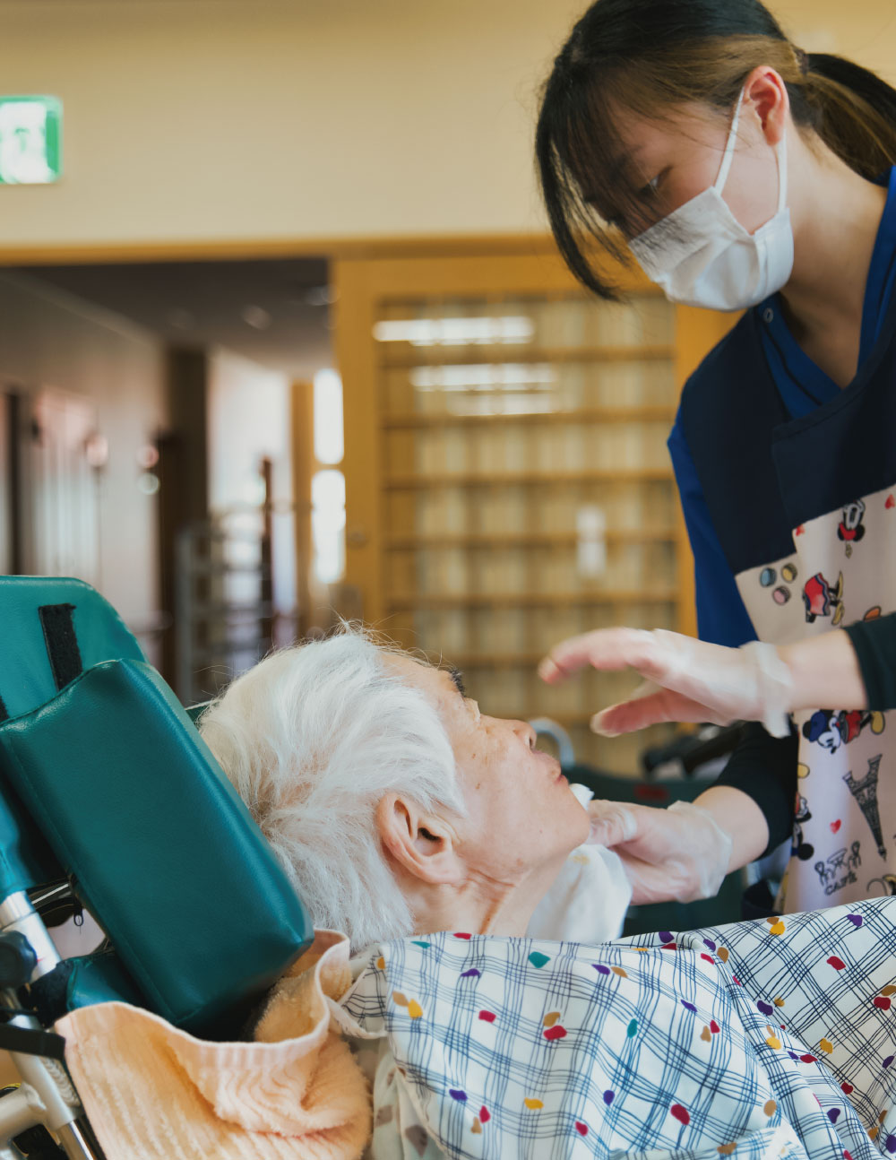 I.S―どんなケアをするときでも、まず「声かけ」が一番大切だと思っています。誰だっていきなり口にご飯を入れられたら嫌ですよね。車椅子を動かすときも「動きますよ」と声をかけるだけで、驚く度合いも違います。それに、今はずっとマスクをしていて目しか見えませんが、笑顔でいることも大事だと思います。