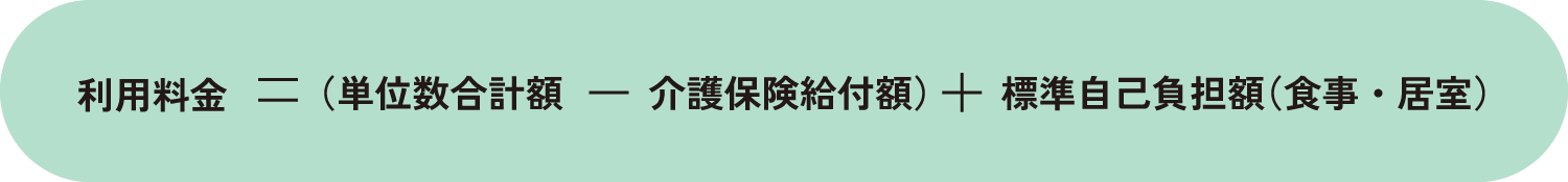 ご利用者の要介護度に応じた単位数合計額(短期入所生活介護費及び各種加算)ら介護保険給付費額(9割・8割・7割)を除いた金額(自己負担額)と食事と居室に係る標準自己負担額の合計金額をお支払いください。