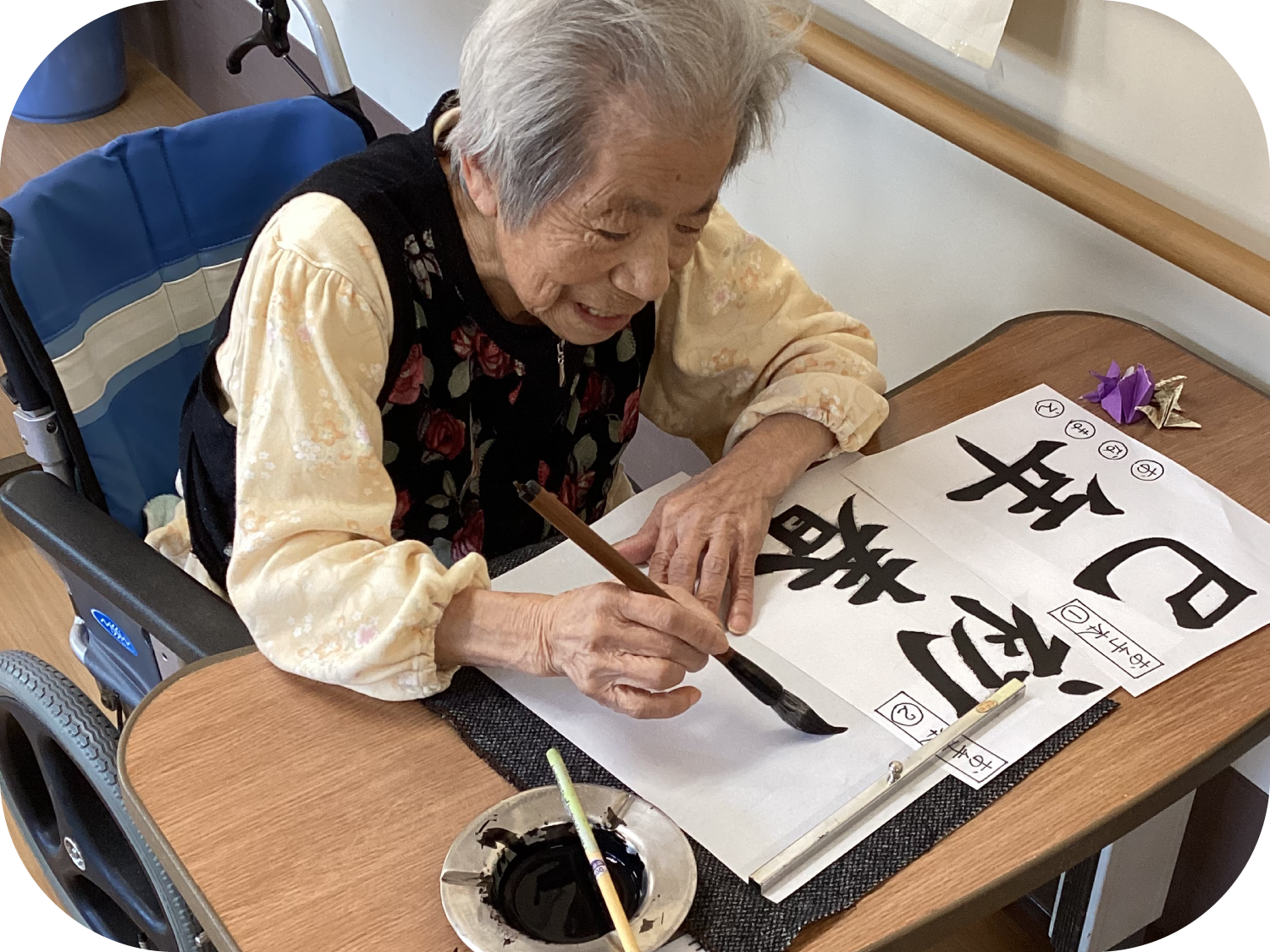 レクリエーションの一環として四季折々の作品を制作しています。制作物については、面会に来られたご家族にも見ていただけるように、施設内に掲示し、広報誌にも掲載しています。 -